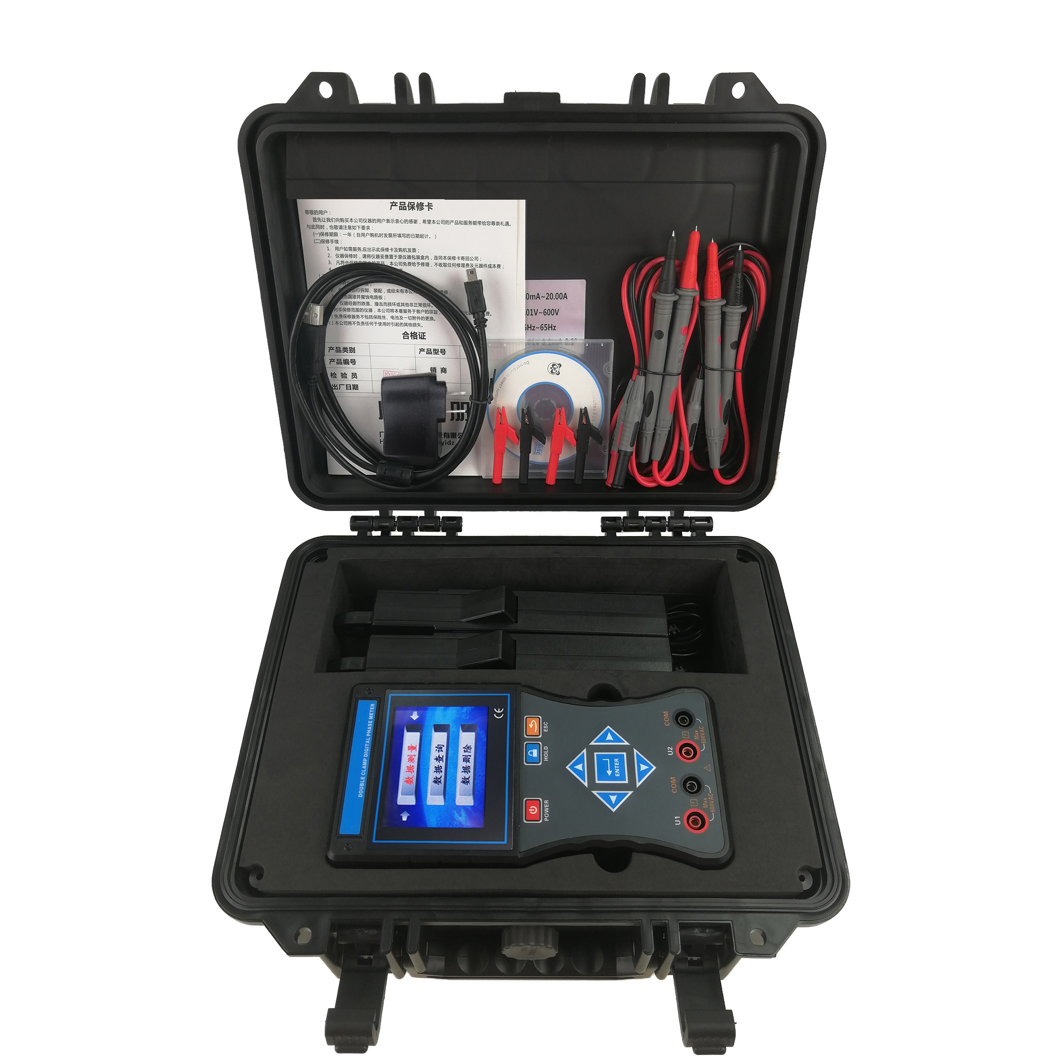 CA6220雙鉗智能相位伏安表是一款專為現(xiàn)場測試的多功能智能儀表,由主機(jī)、電流鉗(2把)、測試線(4條)等組成。主機(jī)采用3.5寸真彩液晶屏,圖形菜單界面顯示,所測參數(shù)同屏顯示,一目了然。電流鉗一體化手柄設(shè)計(jì),便于操作,非常適用于排線密集的場所。儀表可以在被測回路不開路的情況下,同時測量兩路交流電壓、電流、電壓間相位、電流間相位、電壓電流間相位、頻率、有功功率、無功功率、視在功率、功率因數(shù),判別變壓器接線組別、感性、容性電路,測試二次回路和母差保護(hù)系統(tǒng),讀出差動保護(hù)各組CT之間的相位關(guān)系,檢查電度表的接線正